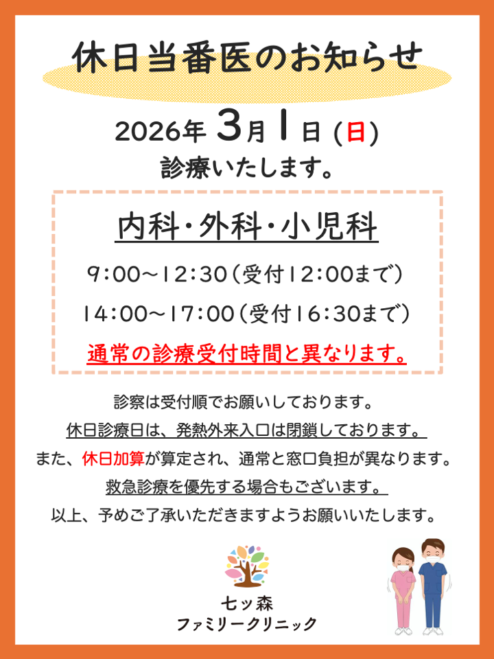 2026年3月1日の休日診療のお知らせ